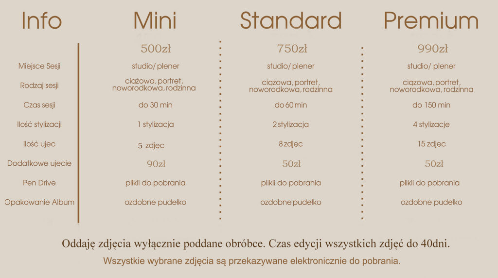 Na mojej stronie znajdą Państwo cennik usług współmierny nie tylko do jakości oferowanego produktu, ale też do zaangażowania w proces jego powstawania, które na tę jakość wpływa: od przygotowania klienta, pracę w czasie sesji, aż po etap finalny w postaci gotowych zdjęć.